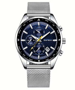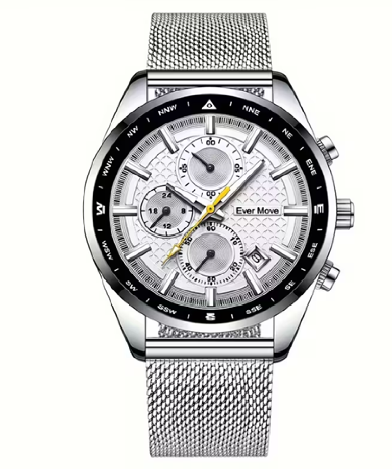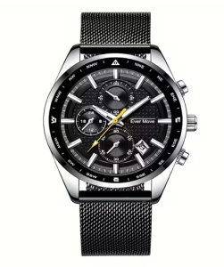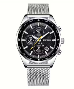 El cronógrafo puede cronometrar eventos de hasta 12 horas al segundo más cercano. Para lograr una apariencia perfectamente elegante, el reloj se combina con una pulsera de eslabones múltiples de acero inoxidable en tono plateado con cierre desplegable. Eleve su guardarropa con un diseño que nunca pasa de moda con este nuevo reloj cronógrafo para hombre.