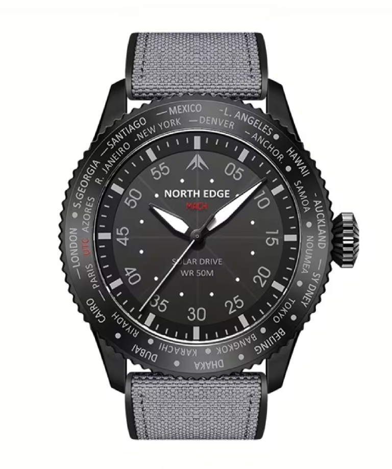 Este Super AVI Mosquito se inspira en el Night Fighter 2, un biplaza completamente negro diseñado para surcar sigilosamente el cielo nocturno. Como un auténtico reloj de piloto diseñado para soportar los rigores de una cabina clásica, el Super AVI Mosquito presenta grandes números arábigos de fácil lectura en la esfera y el bisel. La caja de cerámica negra contrasta llamativamente con los pulsadores, la corona, el fondo y la hebilla de titanio. El bisel moleteado proporciona un agarre óptimo, incluso con guantes. La correa de cuero militar evoca el equipamiento de vuelo clásico. Los pilotos y otros viajeros apreciarán la posibilidad de consultar una segunda zona horaria gracias a la marca de 24 horas del bisel interior y la manecilla GMT con punta blanca. El motor del Super AVI es el movimiento del MACH que proporciona aproximadamente 70 horas de reserva de marcha por ser un Drive Solar.