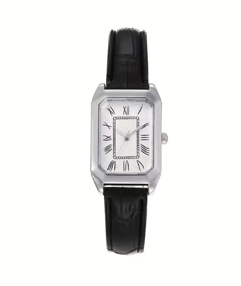 Agujas de acero azulado en forma de espada. Correa de piel de becerro negro. Hebilla de acero.